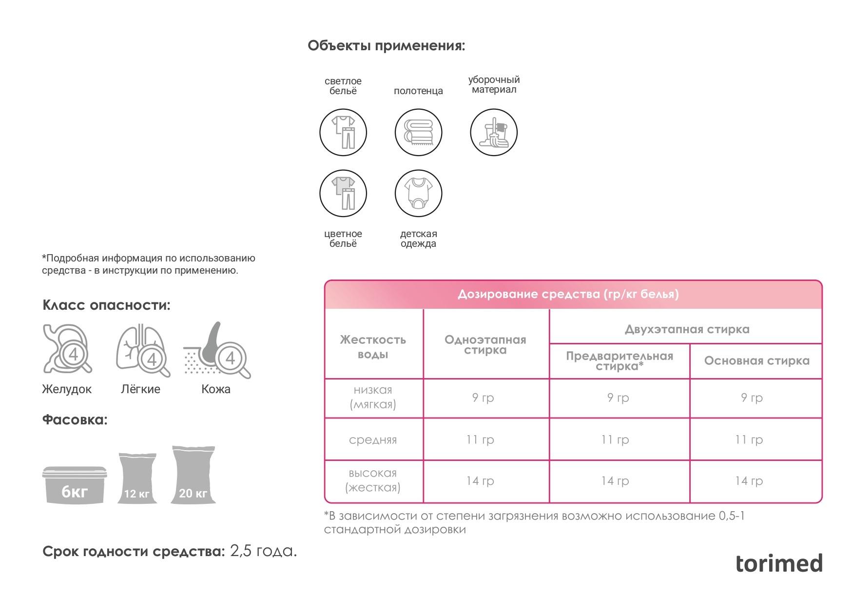 Ph 8,3±0,5 Состав: Перкарбонат натрия - 15%, активатор, отбеливатель, комплекс ПАВ, функциональные компоненты. Антимикробная активность в отношении: Бактерии (грамотрицательные и грамположительные, включая микобактерии туберкулеза (тестировано на M.terrae); Вирусы; Грибы (рода Кандида, дерматофитов, плесневые грибы). Универсальное кислородсодержащее средство Средство предназначено для единовременной стирки, дезинфекции, отбеливания и выведения пятен с текстильных изделий; Средство препятствует образованию накипи; Может использоваться для стирки в диапазоне температур от 30ºС до 90ºС в воде любой жесткости; Эффективно удаляет пятна различной этиологии с обрабатываемых тканей; Идеально подходит для стирки текстильных изделий в ЛПУ. Области применения: Предназначено для использования в профессиональных и бытовых стиральных машинах любого типа, в том числе с дозирующими устройствами, а также может использоваться в ходе ручной стирки и замачивании белья.