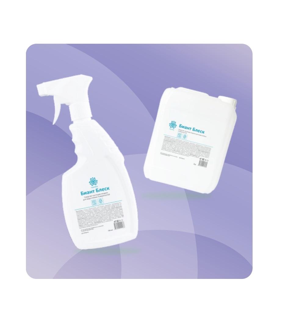 Ph 8,0±0,5 Состав: Менее 5%: гидроксиэтилцеллюлоза, аммиак,НПАВ; 5-15% изопропанол. Антимикробная активность: Бактерии; Вирусы; Грибы. Дезодорирующее средство Высококонцентрированная рецептура позволяет обеспечить экономичный расход средства; Обладает хорошими моющими и чистящими свойствами; Подходит для керамических, пластиковых, акриловых, хромированных, нержавеющих, стеклянных, зеркальных поверхностей. Области применения: Биант Блеск удаляет загрязнения с любого типа глянцевых поверхностей.