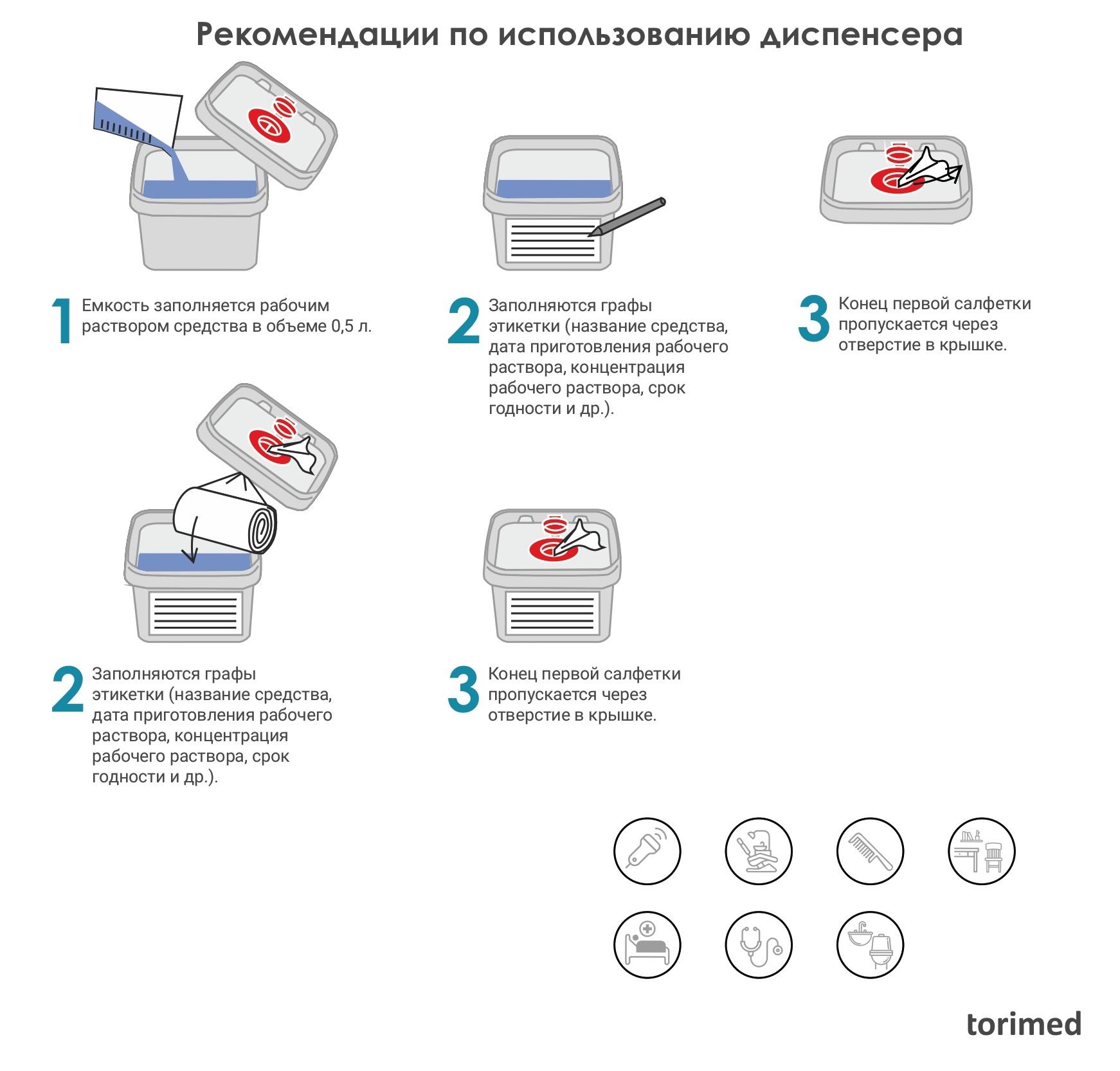 Диспенсер серии Х используется многократно в ходе проведения текущих, профилактических и генеральных уборок, а также антисептической обработки кожных покровов. В зависимости от необходимости, для пропитки салфеток могут применяться растворы дезинфицирующих (в том числе антисептических) и моющих средств.