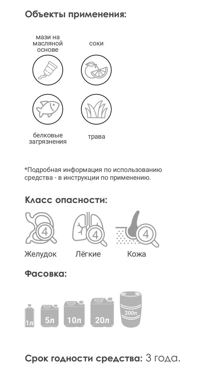 Ph 7-10 Состав: Комплекс ПАВ ≥ 20%, спиртосодержащий компонент ≥ 5%, функциональные добавки. Средство для удаления пятен Предназначено для удаления сложных пятен (жир, следы пота, крови, травы, фруктовых соков, вина и т.д.); Может применяться как нанесением непосредственно на пятно, так и добавлением при стирке; Подходит для автоматической и ручной стирки; Выпускается в двух формах: в виде готового раствора и концентрата; Средство совместимо со всеми продуктами линейки «Light Touch». Применение пятновыводителя Готовый к применению пятновыводитель наносят на смоченное водой пятно, после чего следует потереть пятно щеточкой и оставить на 5-15 минут, затем приступить к стирке. Пятновыводитель в концентрированном виде добавляется в приёмный лоток или же непосредственно в барабан стиральной машины в объеме, соответствующем степени загрязнения белья. Области применения: Пятновыводитель Light Touch Эко с легкостью удаляет сложные пятна.