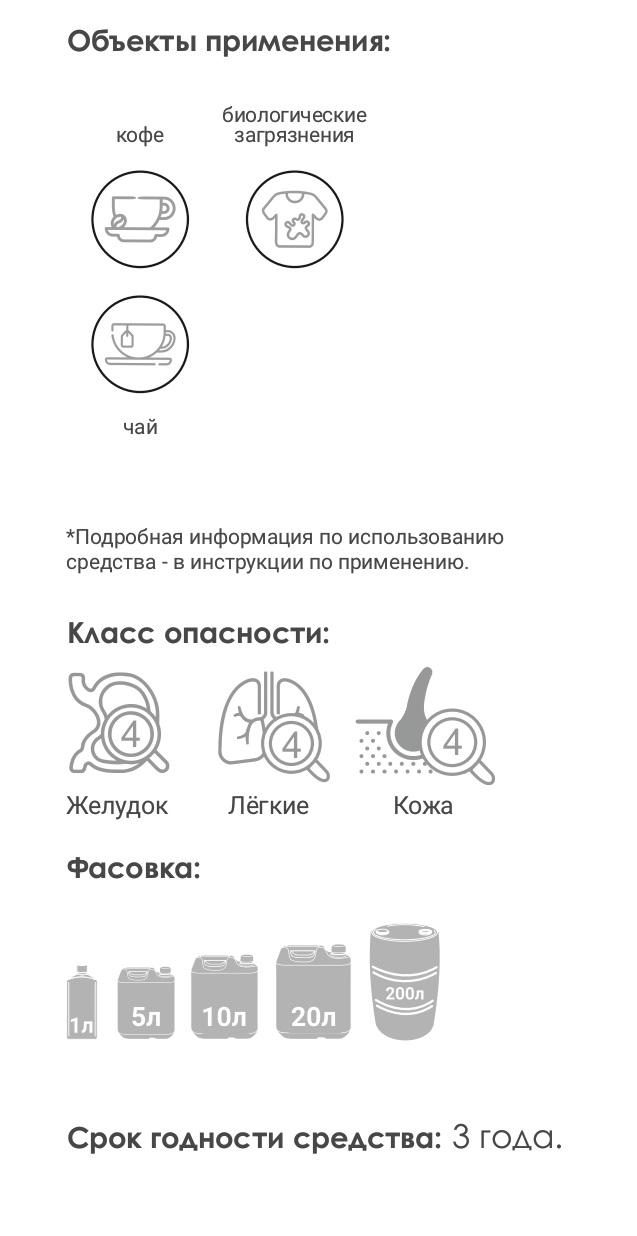 Ph 2-4 Состав: ПАВ ≥ 15%, органические кислоты ≥ 4,5%, функциональные добавки. Средство для удаления пятен Предназначено для удаления сложных пятен (чая, кофе, ржавчины и т.д); Может применяться как нанесением непосредственно на пятно, так и добавлением при стирке; Подходит для автоматической и ручной стирки; Выпускается в двух формах: в виде готового раствора и концентрата; Средство совместимо со всеми продуктами линейки «Light Touch». Применение пятновыводителя Готовый к применению пятновыводитель наносят на смоченное водой пятно, после чего следует потереть пятно щеточкой и оставить на 5-15 минут, затем приступить к стирке. Пятновыводитель в концентрированном виде добавляется в приёмный лоток или же непосредственно в барабан стиральной машины в объеме, соответствующем степени загрязнения белья. Области применения: Пятновыводитель Light Touch Ультра с легкостью удаляет сложные пятна.