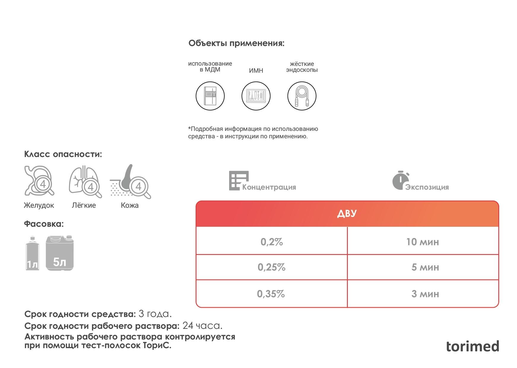 Ph 2,7±0,2 Состав: Компонент 1: перекись водорода 24%,стабилизатор, функциональные компоненты. Компонент 2: перекись водорода 0,4%, антикоррозионный агент, стабилизатор, функциональные компоненты. Антимикробная активность в отношении: Бактерии (грамотрицательные и грамположительные, включая микобактерии туберкулеза (тестировано на M.terrae); Вирусы; Грибы (рода Кандида, дерматофитов,плесневые грибы); Спороцидная активность. Дезинфицирующее средство На основе надуксусной кислоты и перекиси водорода, подходит для: дезинфекции инструментов из термолабильных и термостабильных материалов; ДВУ, стерилизации ИМН; Дезинфекции, совмещенной с ПСО; Окончательной очистки эндоскопов. Быстрое растворение в воде при температуре от 18°C; Обладает хорошими моющими свойствами при низком пенообразовании; Не фиксирует органические загрязнения; Растворы средства не портят обрабатываемые объекты, не вызывают коррозии металлов. Области применения: ТориС предназначен для обработки изделий медицинского назначения (включая хирургические и стоматологические, жесткие и гибкие эндоскопы) ручным и механизированным способом.