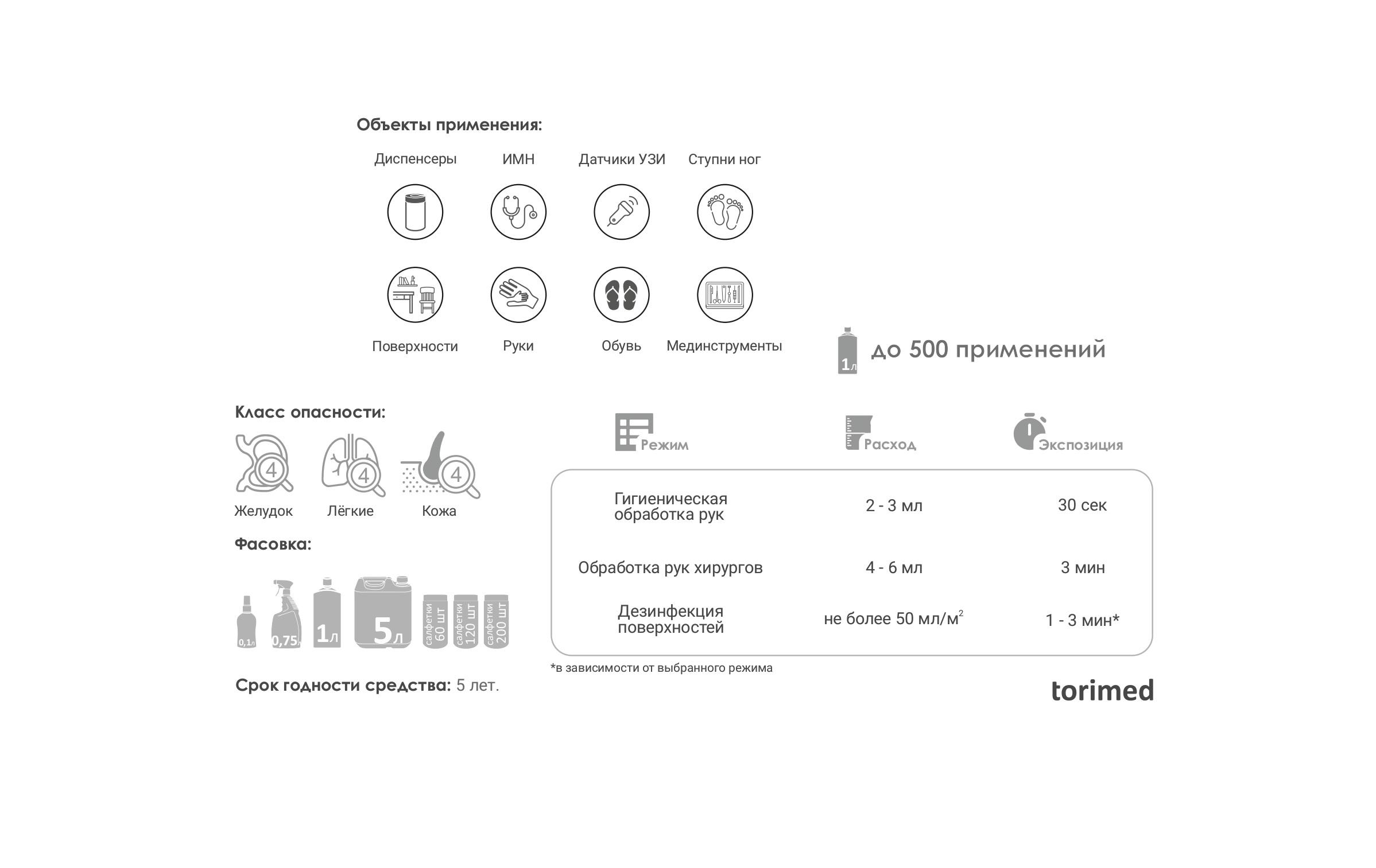 Ph 6,25±0,5 Состав: Комплекс изопропилового и пропилового спиртов в равных долях 70% суммарно, комплекс ЧАС 0,1% суммарно, хлоргексидина биглюконат 0,2%, увлажняющие компоненты, функциональные добавки. Антимикробная активность в отношении: Грамотрицательных и грамположительных бактерий (в том числе возбудителей туберкулеза, тестировано на M.terrae); Вирусов; Патогенных грибов (в том числе возбудителей кандидозов и трихофитии), плесневых грибов. Преимущества: Препарат двойного назначения; Уничтожает до 99,99% патогенных микроорганизмов; Для гигиенической и хирургической обработки рук; Средство не сушит кожу; Подходит для обработки кожи детей; Комплекс меди и цинка ускоряет заживление поврежденной кожи, усиливает антисептические свойства средства; Растительный комплекс увлажняет и ухаживает за кожей рук; Быстрая дезинфекция поверхностей; Обладает пролонгированным эффектом в течение 6 часов. Области применения: Медицинские организации различного профиля; Детские учреждения; Предприятия различных отраслей промышленности: Административные учреждения; Инфекционные очаги; Населением в быту.