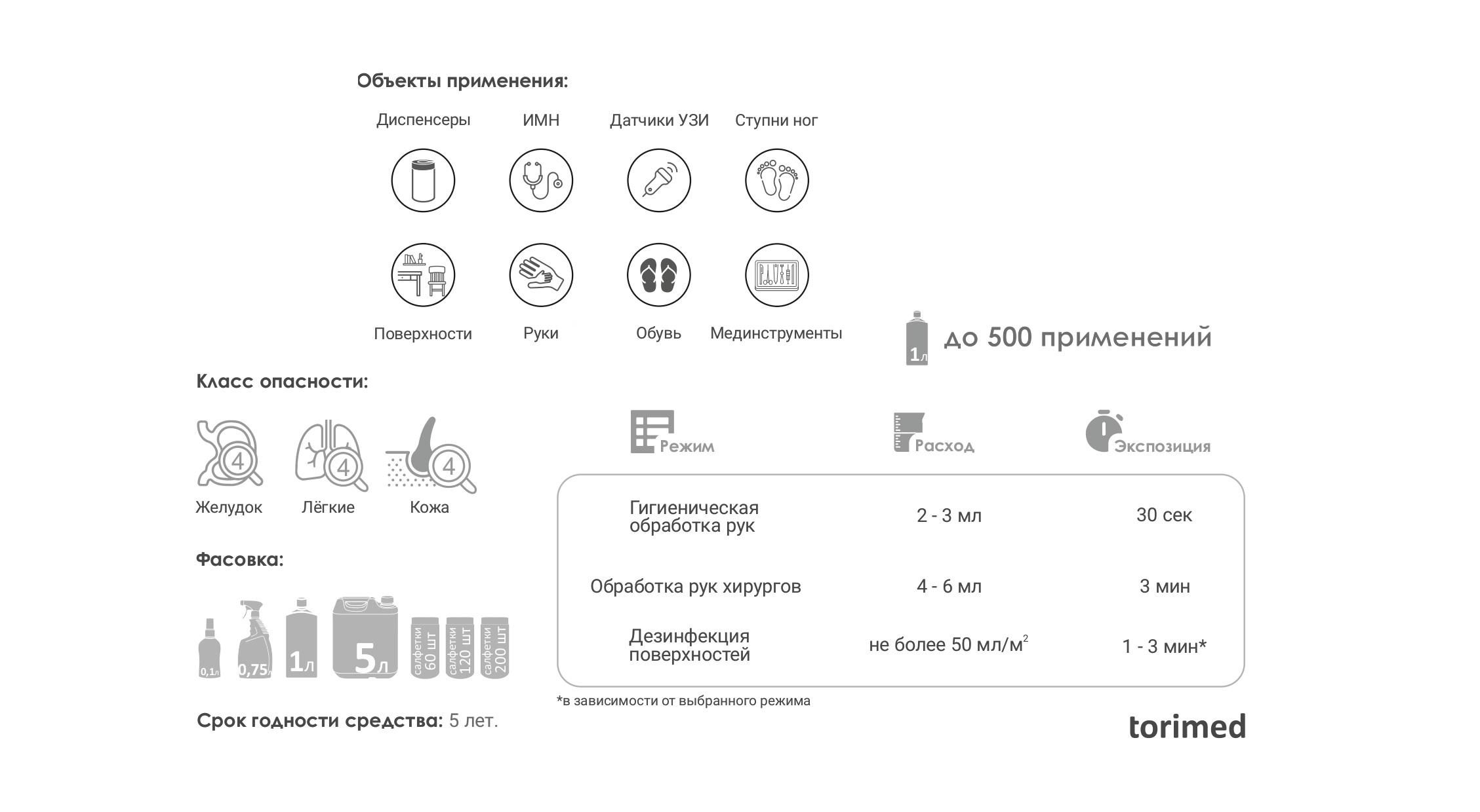 Рһ 6,25±0,75 Состав: Комплекс изопропилового и пропилового спиртов 70% суммарно, перекись водорода 0,41%, компоненты, смягчающие кожу рук (комплекс меди и цинка или компоненты растительного происхождения (в т.ч. эфирные маслаи/или экстракты), функциональные добавки. Антимикробная активность в отношении: Бактерии (грамотрицательные и грамположительные, включая микобактерии туберкулеза (тестировано на M.terrae); Вирусы; Грибы (рода Кандида, дерматофитов, плесневые грибы). Преимущества: Препарат двойного назначения; Уничтожает до 99,99% патогенных микроорганизмов; Для гигиенической и хирургической обработки рук; Средство не сушит кожу; Подходит для обработки кожи детей; Комплекс меди и цинка ускоряет заживление поврежденной кожи, усиливает антисептические свойства средства; Растительный комплекс увлажняет и ухаживает за кожей рук; Быстрая дезинфекция поверхностей; Обладает пролонгированным эффектом в течение 6 часов. Области применения: Медицинские организации различного профиля; Детские учреждения; Предприятия различных отраслей промышленности: Административные учреждения; Инфекционные очаги; Населением в быту.