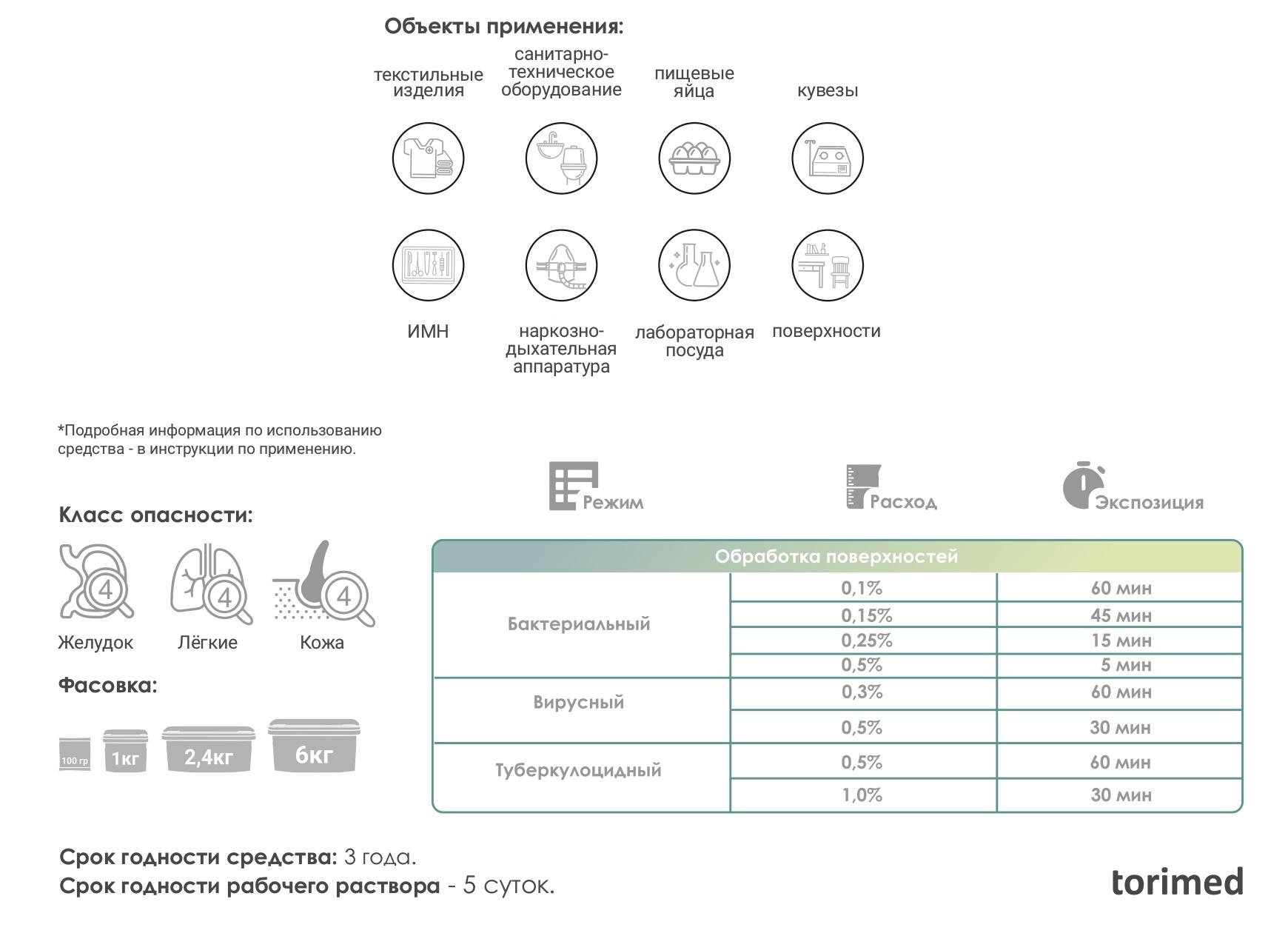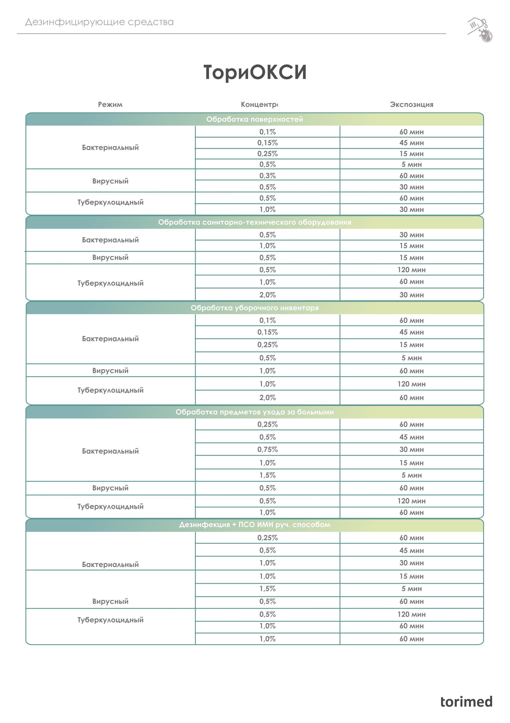 Рһ 7,8±1,0 Состав: Перкарбонат натрия 55%, активатор, вспомогательные компоненты. Действующее вещество - активный кислород 9-11%. Антимикробная активность в отношении: Бактерии (грамотрицательные и грамположительные, включая микобактерии туберкулеза (тестировано на M.terrae); Вирусы; Грибы (рода Кандида, дерматофитов, плесневые грибы). Универсальное Подходит для: Всех видов дезинфекции и предстерилизационной очистки; Проведения генеральных уборок; ДВУ и стерилизации. Безопасная альтернатива хлорсодержащим дезинфицирующим средствам; Обладает хорошими моющими и дезодорирующими свойствами; Быстрое растворение в воде при температуре от 18°С; Не фиксирует органические загрязнения; Не требует постановки фенолфталеиновой пробы. Области применения: ТориОКСИ обладает широкой областью применения.