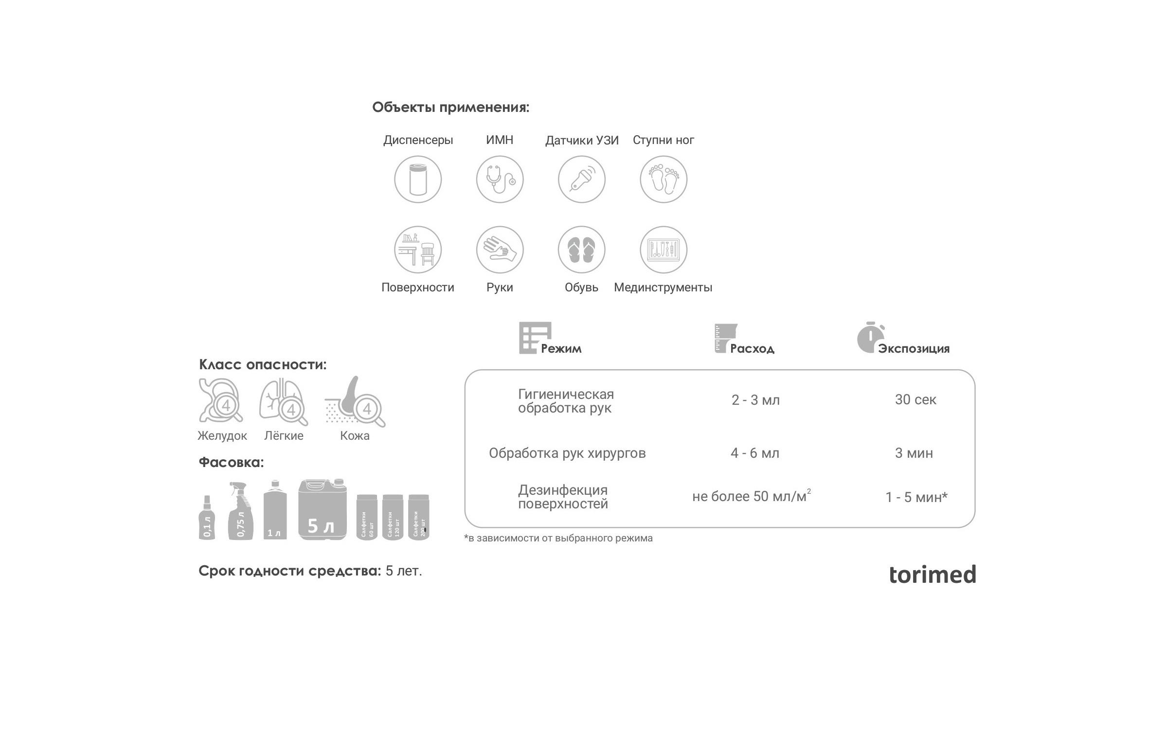 Ph 6,0±0,5 Состав: Перекись водорода 25%, комплекс органических кислов 8% суммарно, концентрат коллоидного серебра, ингибитор коррозии, стабилизатор, вспомогательные компоненты. Антимикробная активность в отношении: Препарат обладает антимикробной активностью в отношении грамотрицательных (включая сальмонеллы) и грамположительных бактерий, в том числе возбудителей туберкулеза (тестировано на культуре тест- штамма M.terrae DSM 43227), возбудителей особо опасных инфекций, легионеллеза, возбудителей анаэробных, внутрибольничных и кишечных инфекций. Преимущества: • Широкая область применения • Растворы средства обладают хорошими моющими (не менее 90%), обезжиривающими, дезодорирующими свойствами (полностью нейтрализуют различные типы запахов). • Средство не вызывает коррозии металлов, не оставляет разводов, не портит обрабатываемые объекты из различных материалов, не фиксирует органические загрязнения. • Средство эффективно удаляет пятна различной природы с различных материалов. При обработке поверхностей способом протирания не требуются средства защиты органов дыхания. Работы можно проводить в присутствии персонала и пациентов. • Средство биоразлагаемое и экологически безопасное при соблюдении правил обращения. Растворы средства обладают пролонгированным действием в течение 5 часов. Области применения: «ТориЦид» подходит для широкого спектра применения, в том числе для профилактической и очаговой дезинфекции, предстерилизационной очистки. Средство обладает дезодорирующими свойствами (полностью нейтрализует неприятные запахи), не оставляет разводов, не портит обрабатываемые объекты из различных материалов, не вызывает коррозии металлов.